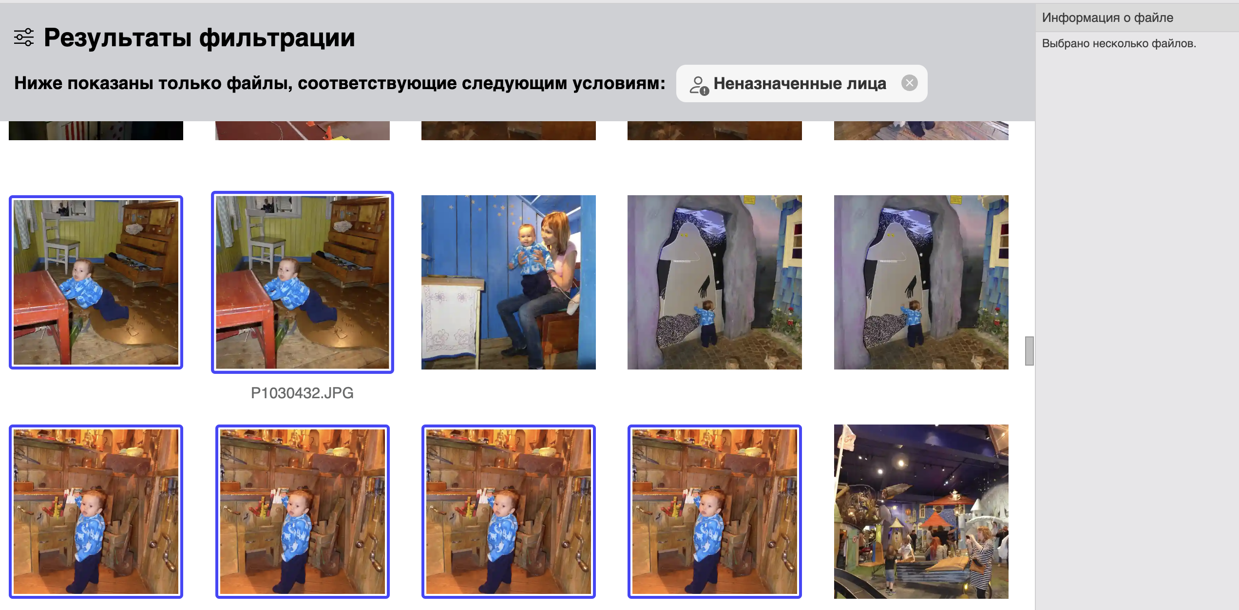 Ниже приведен пример на скриншоте. Все выделенные фото с ребенком содержат еще и ошибочно идентифицированные лица, которые я бы хотел удалить. Но я не уверен, что ребенок везде правильно определен и прежде чем применить cmd+I на эту группу, я должен пробежаться по всем файлам. А так бы выделил их все, увидел в правой панели иконку этого ребенка и нажал cmd+I с уверенностью