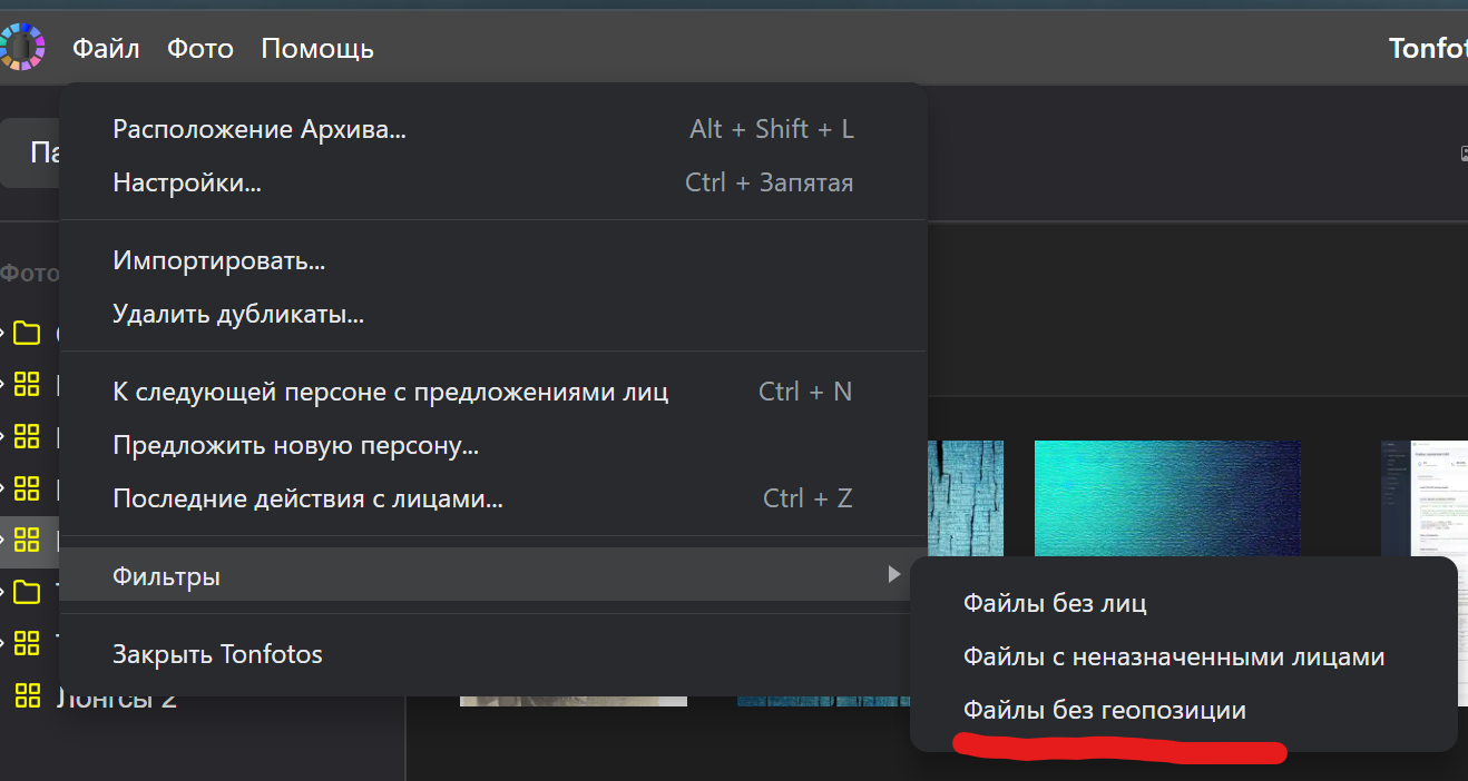 По аналогии с пунктом меню “Файл” - “Показать все файлы с неназначенными лицами” можно ли как-то реализовать явные фильтры по отсутствию места съёмки?